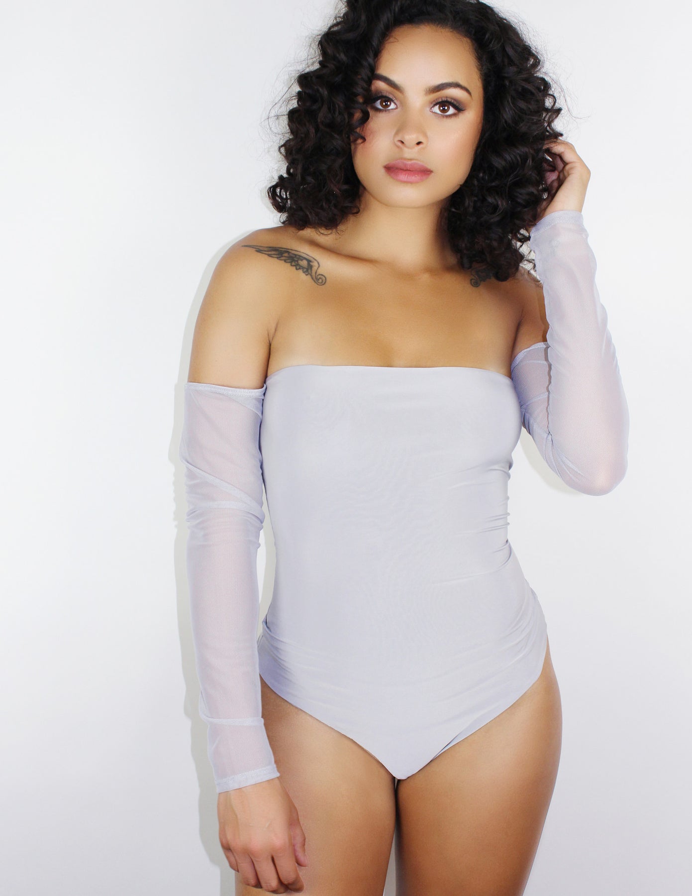 Our Celsius bodysuit features stretchy mesh sleeves and A bardot neckline. The bodysuit itself is very stretchy and lined fully so it isn't see through at all!