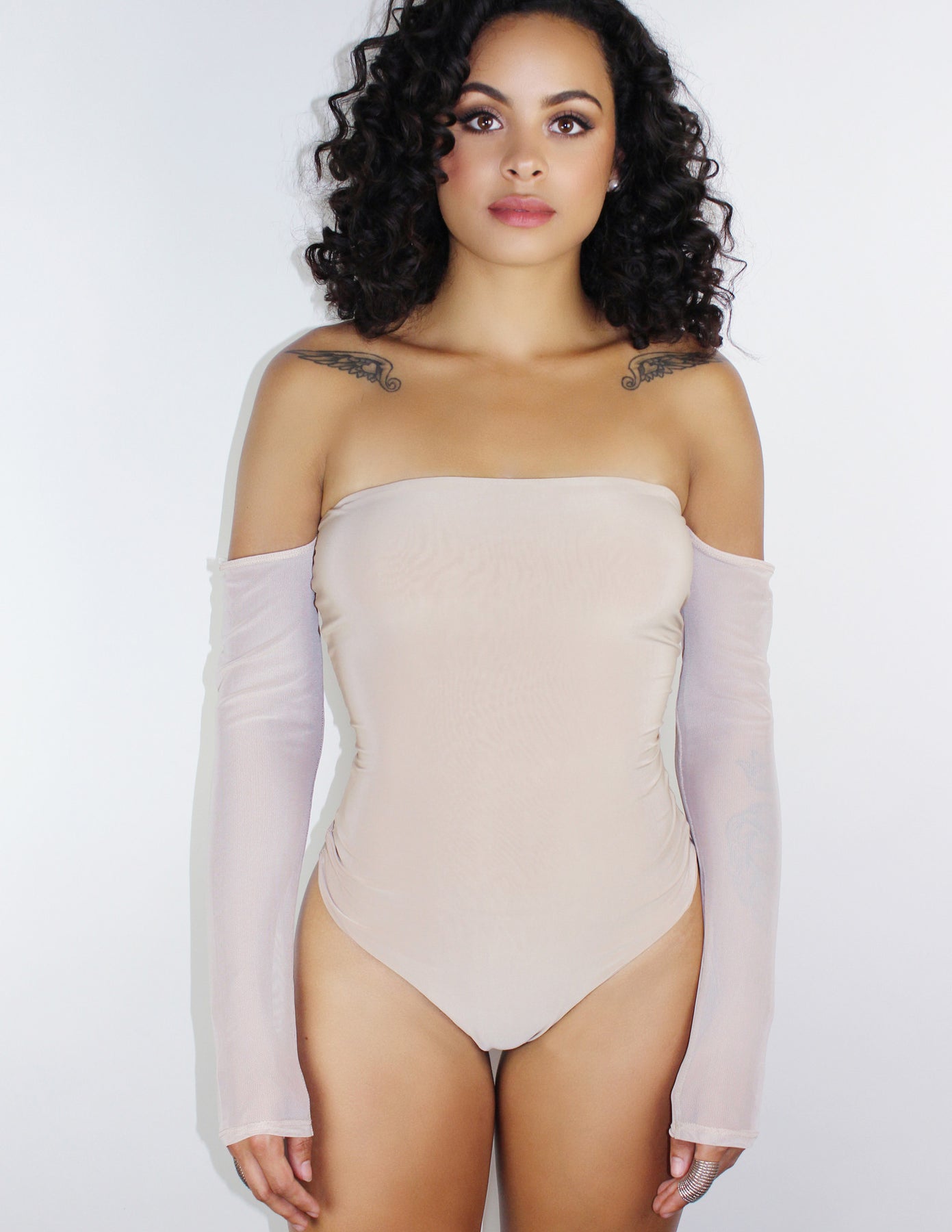 Our FARENHEIT bodysuit features stretchy mesh sleeves and is a slip on with thong design.