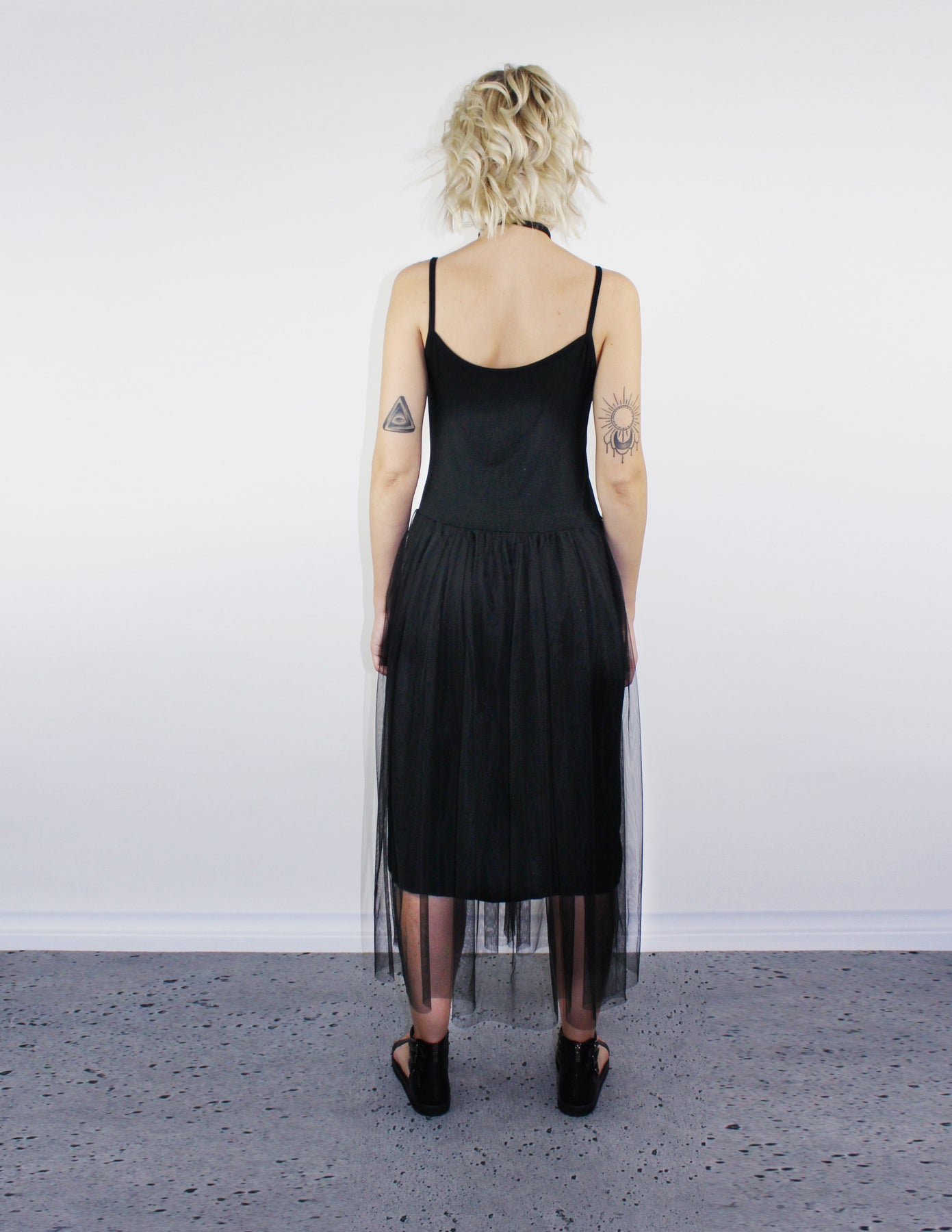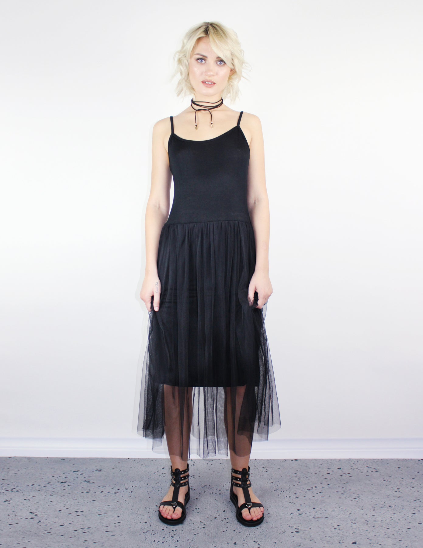 Our Magnet dress is a stretchy midi strappy dress with a tulle veil covering the skirt. Comes in 2 colors.