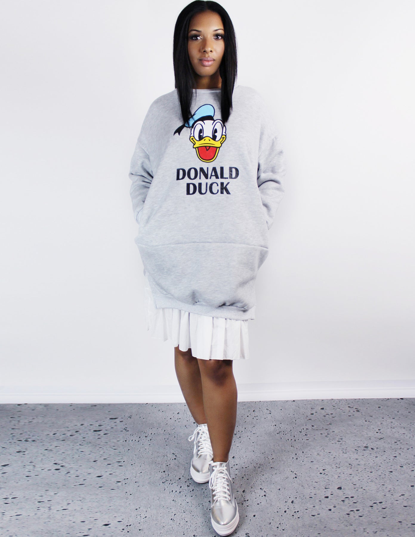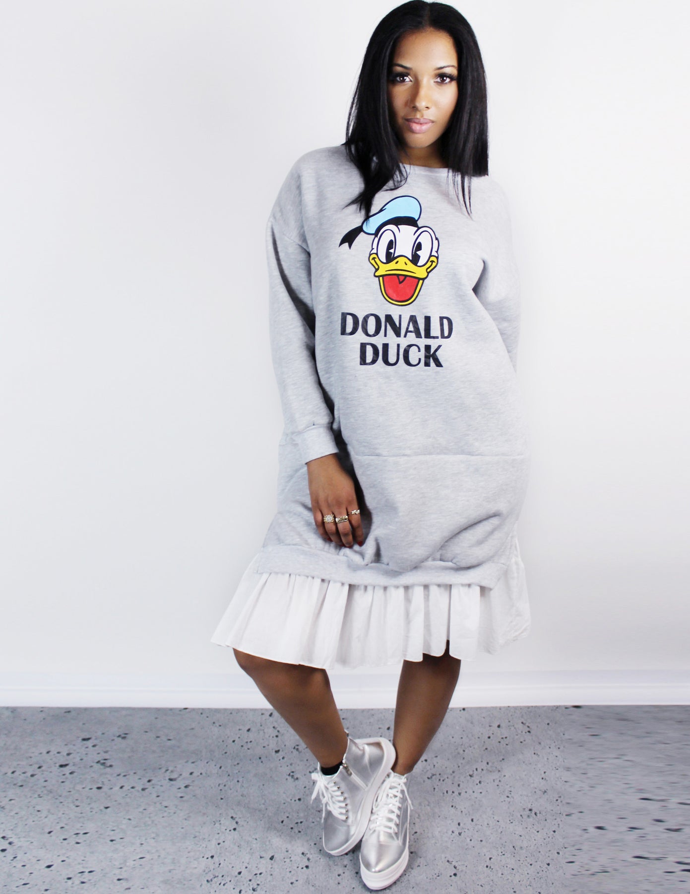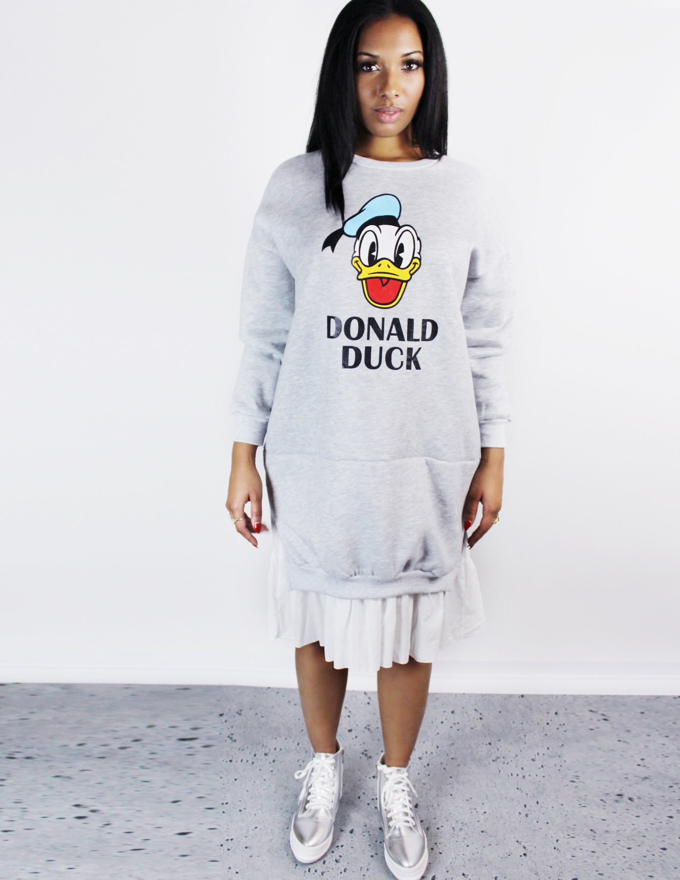 Our Envy Dress features a print of a happy Donald Duck face with its name on the front. It is a long sleeves oversized gray sweatshirt with a white cotton ruffle underlay on the bottom.