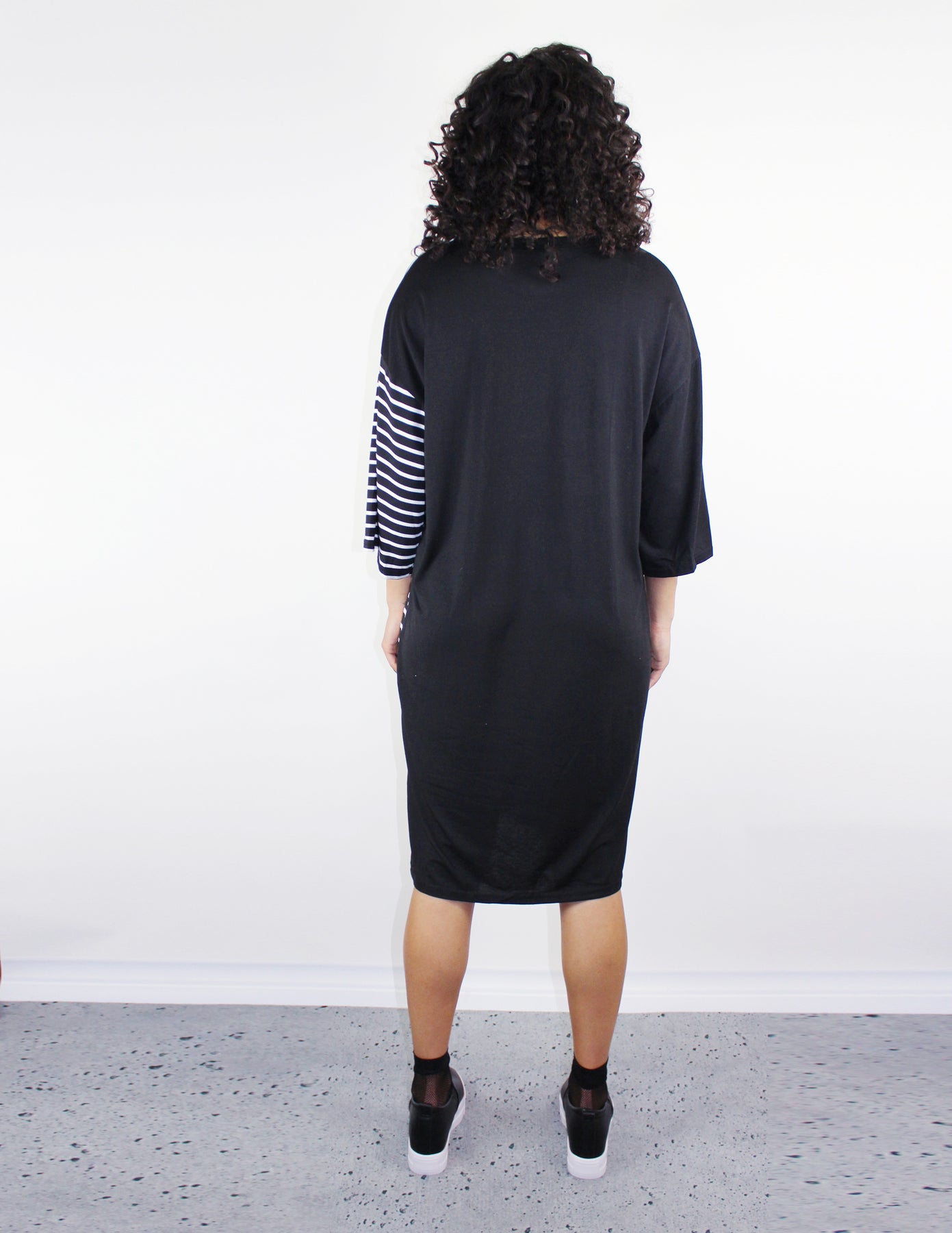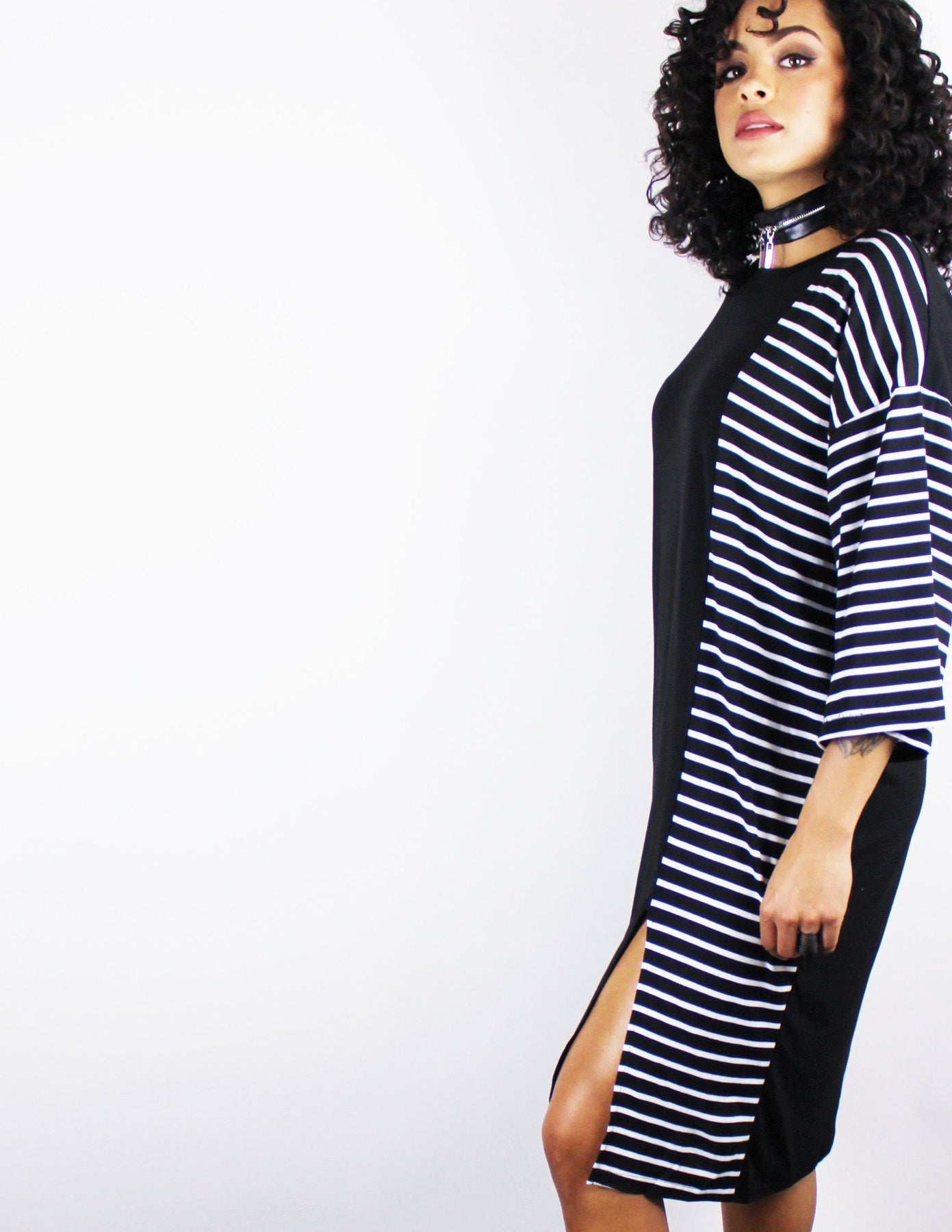 Our FRACTION dress is an oversized long shirt dress with 3/4 sleeves and a small slit in the front.