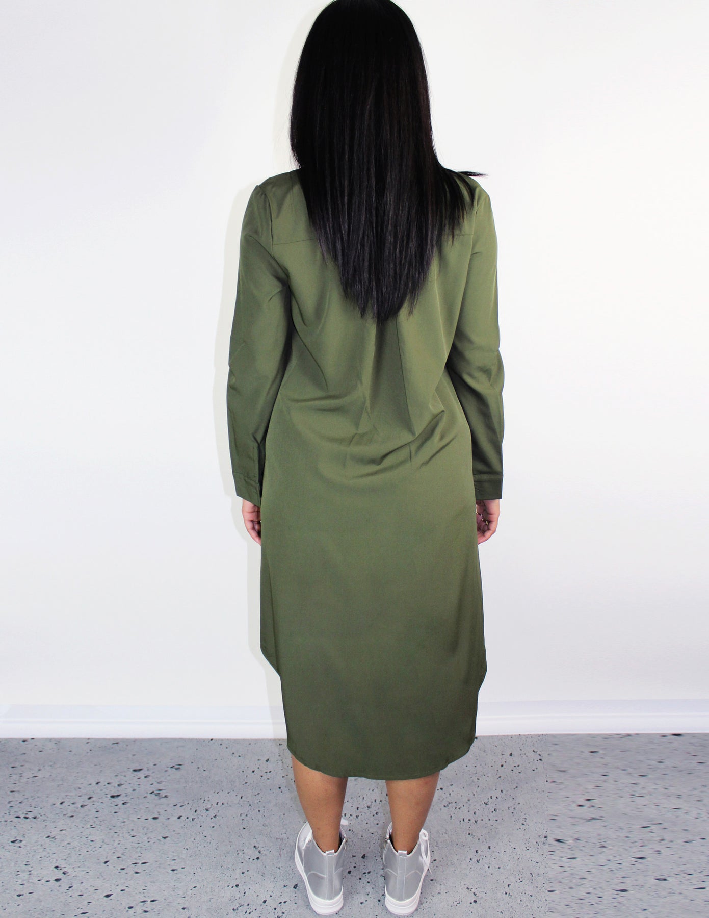 Our Grin dress is an asymmetrical mid length olive chiffon. It features long sleeves, a pussy bow, and front buttons for closure.