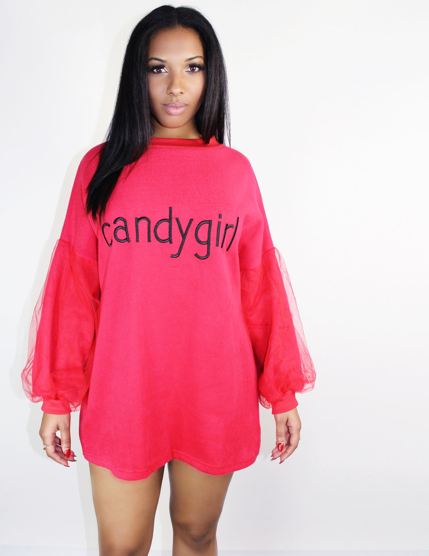 Our Caritas sweatshirt is an oversized long sleeves knit featuring tulle balloon long sleeves. and embroidery on its front.