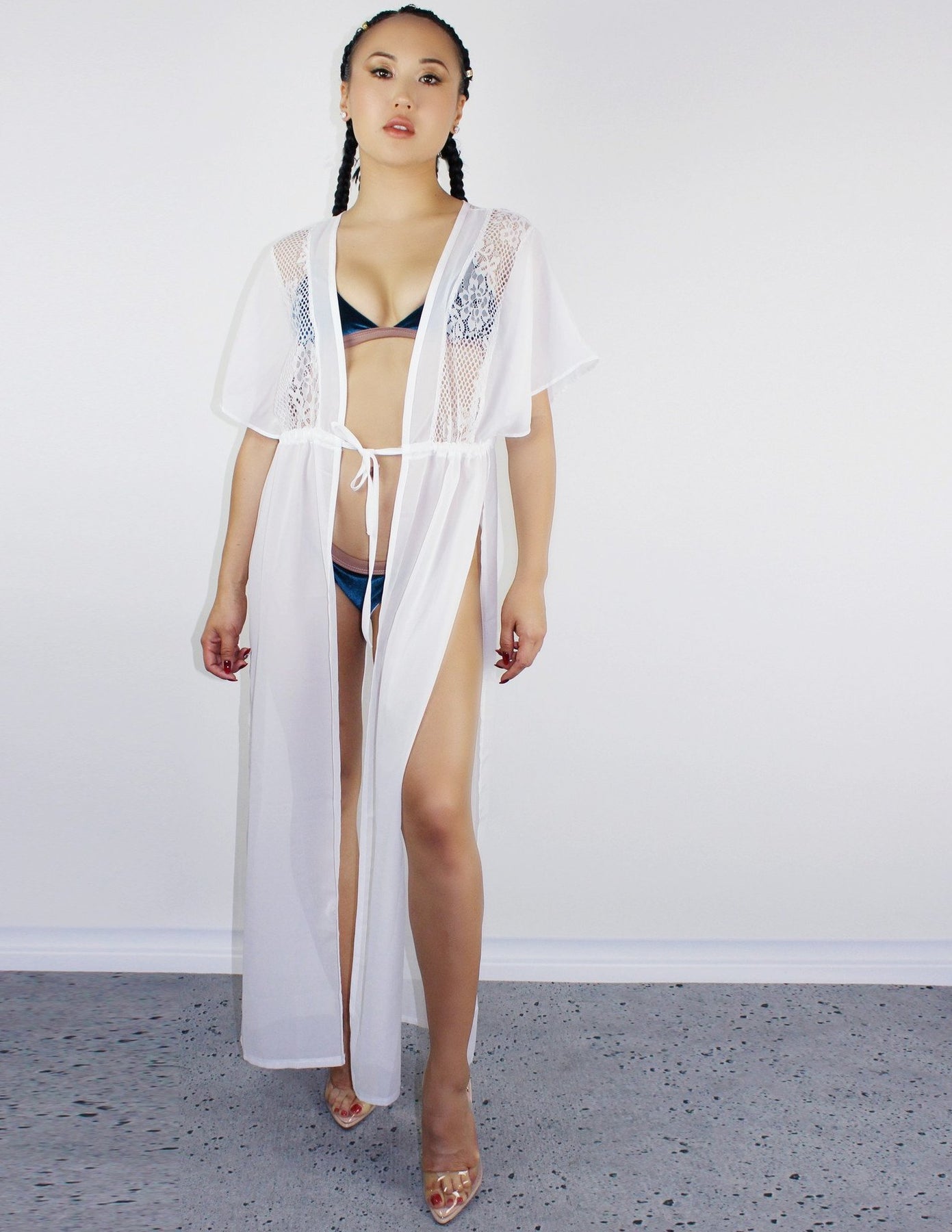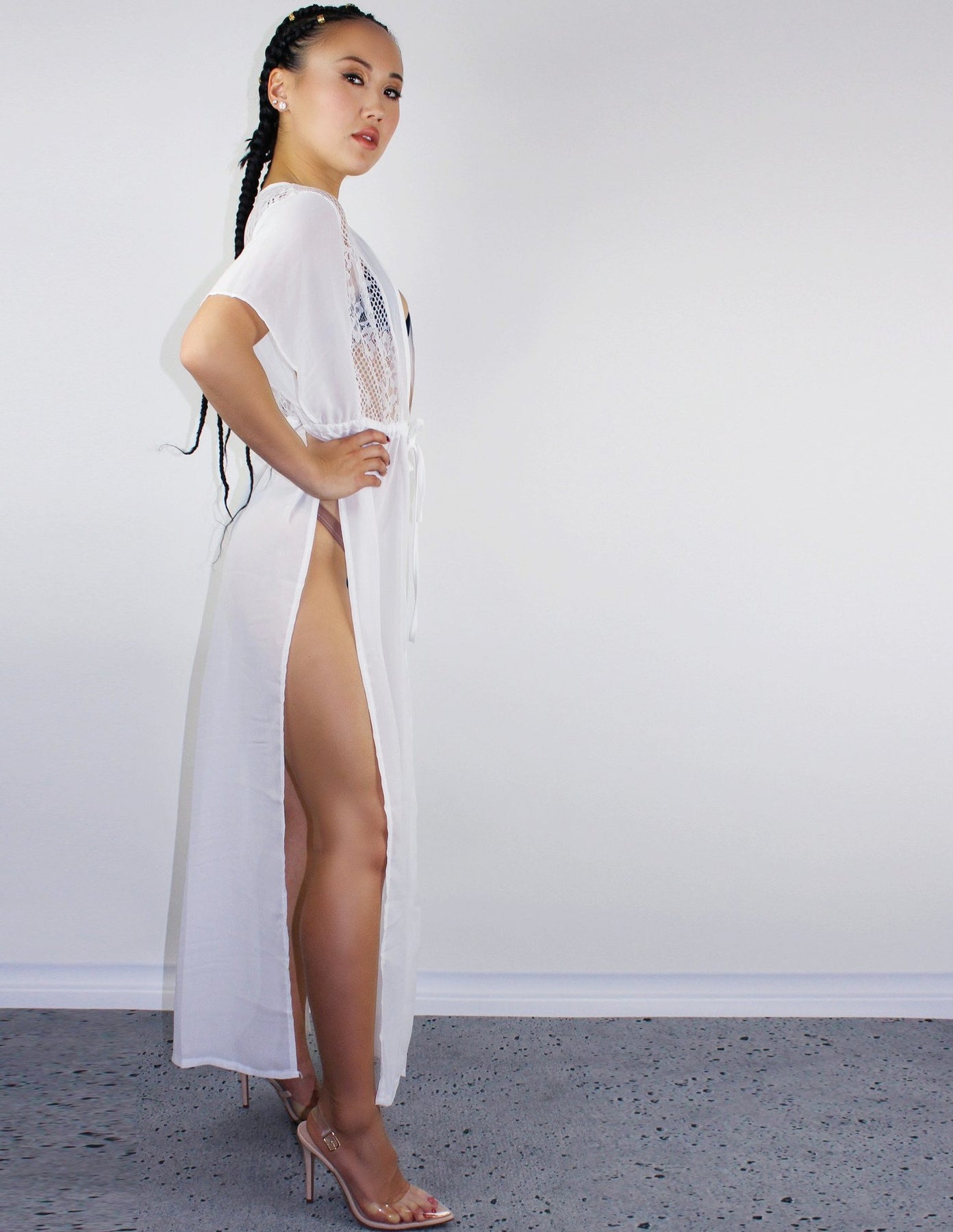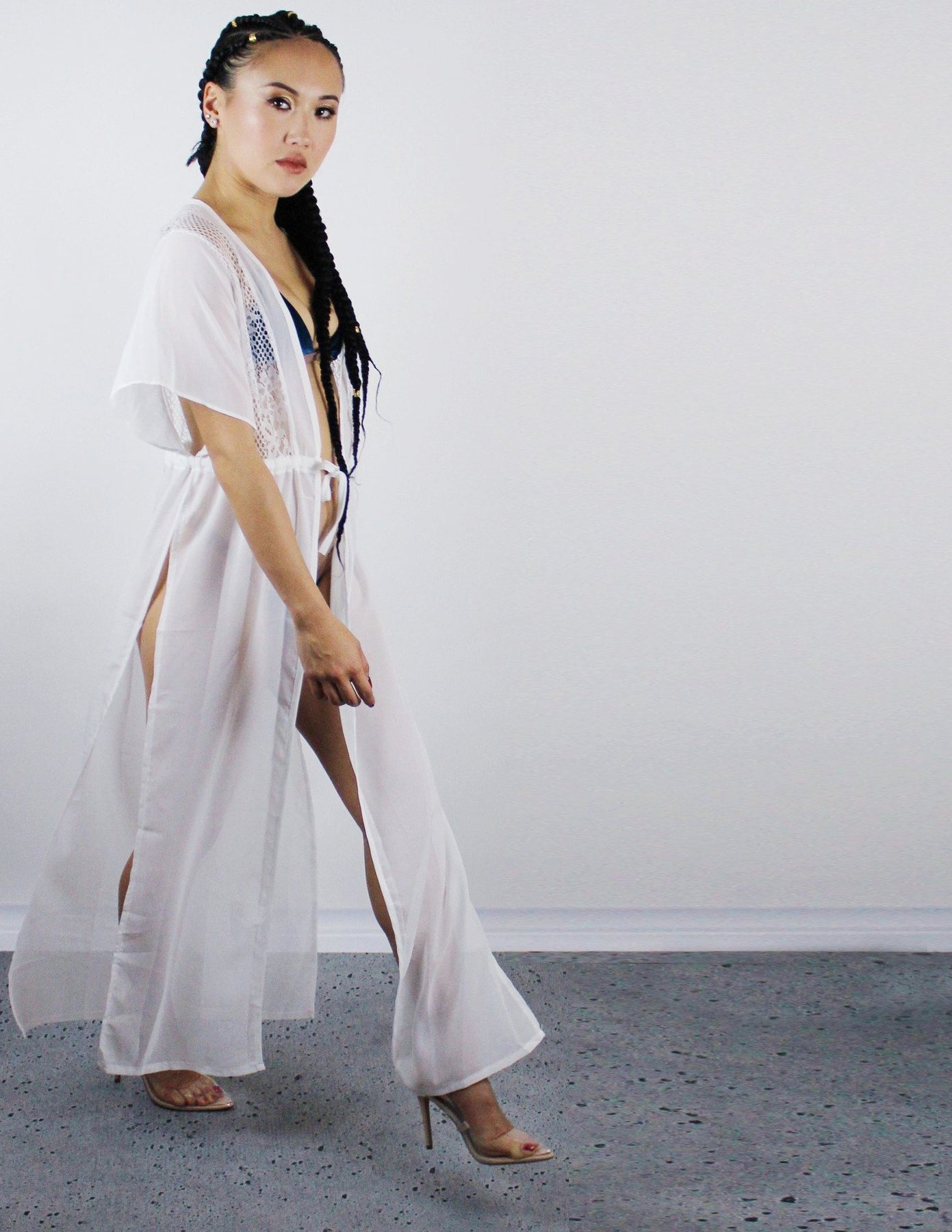 Our FINS cover up is a long chiffon cover up with an adjustable waist tie. Has no stretch.